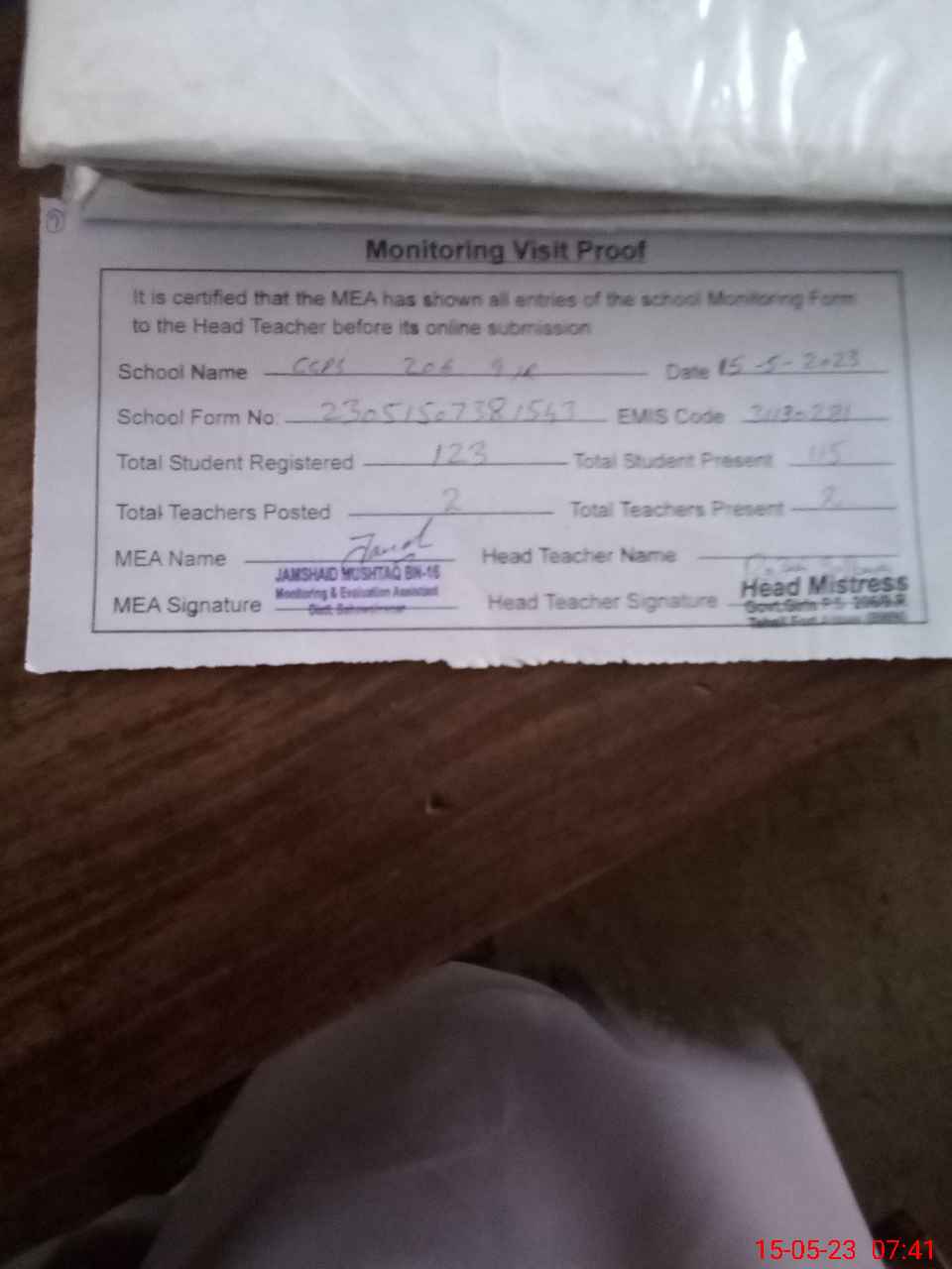 | Certified that this School was Inspected by the Undersigned MEA/DMO Today and the Information Stated Above is as Per Record. | |||||