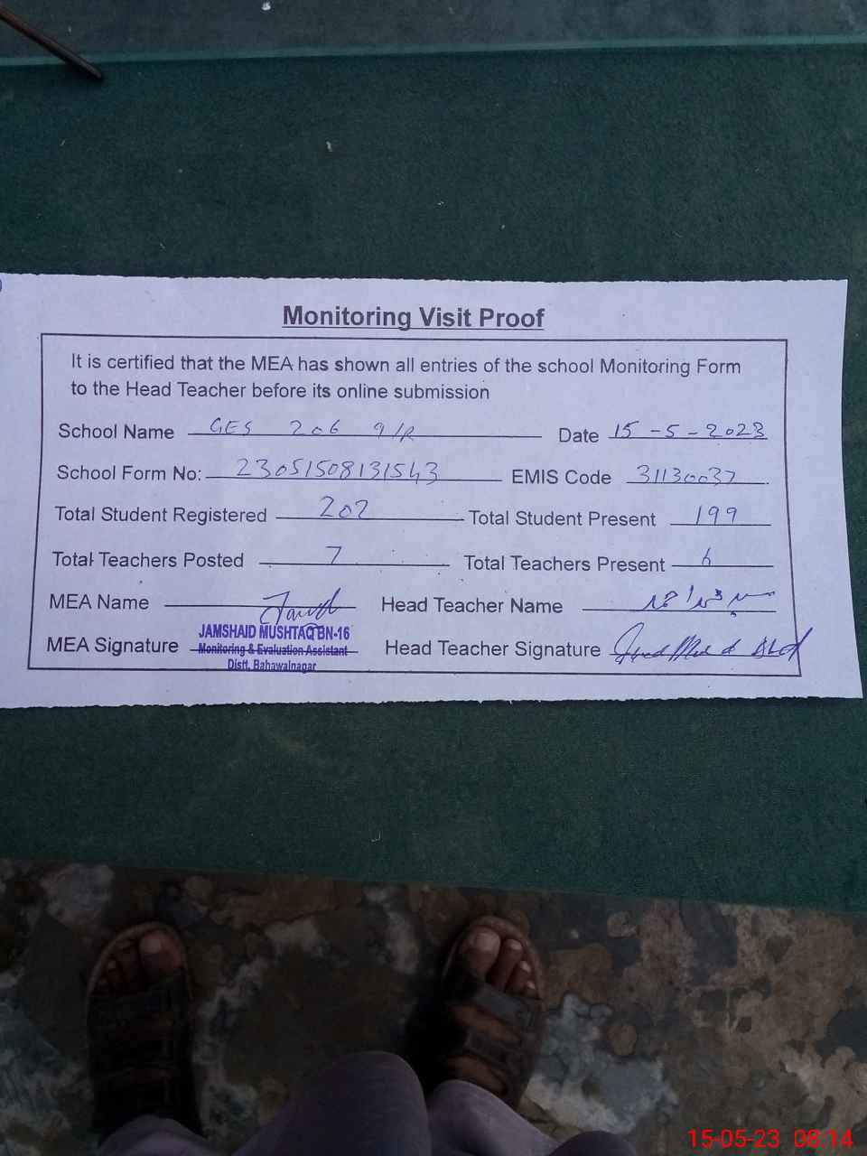 | Attendance Register | Head Teacher | MEA with School | Visit Proof |