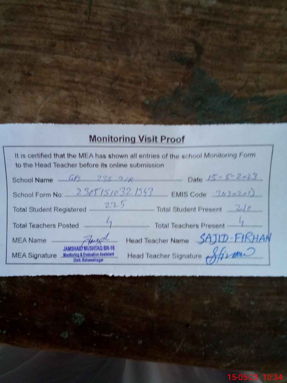 | Attendance Register | Head Teacher | MEA with School | Visit Proof |