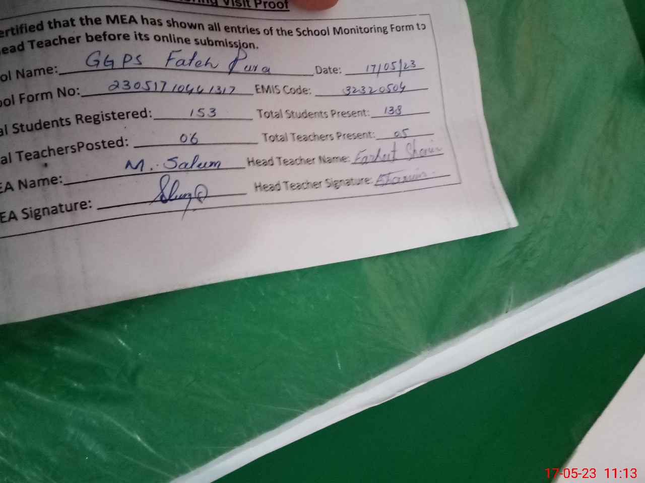 | EMIS Code: 32320504 | Name of School: GGPS FATEH PURA | |||