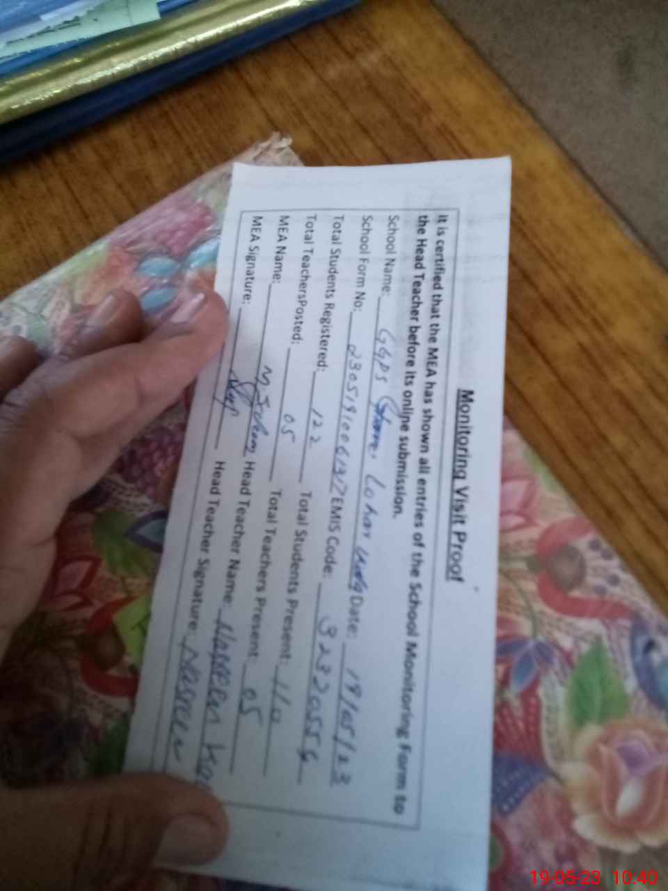 | Attendance Register | Head Teacher | MEA with School | Visit Proof |
