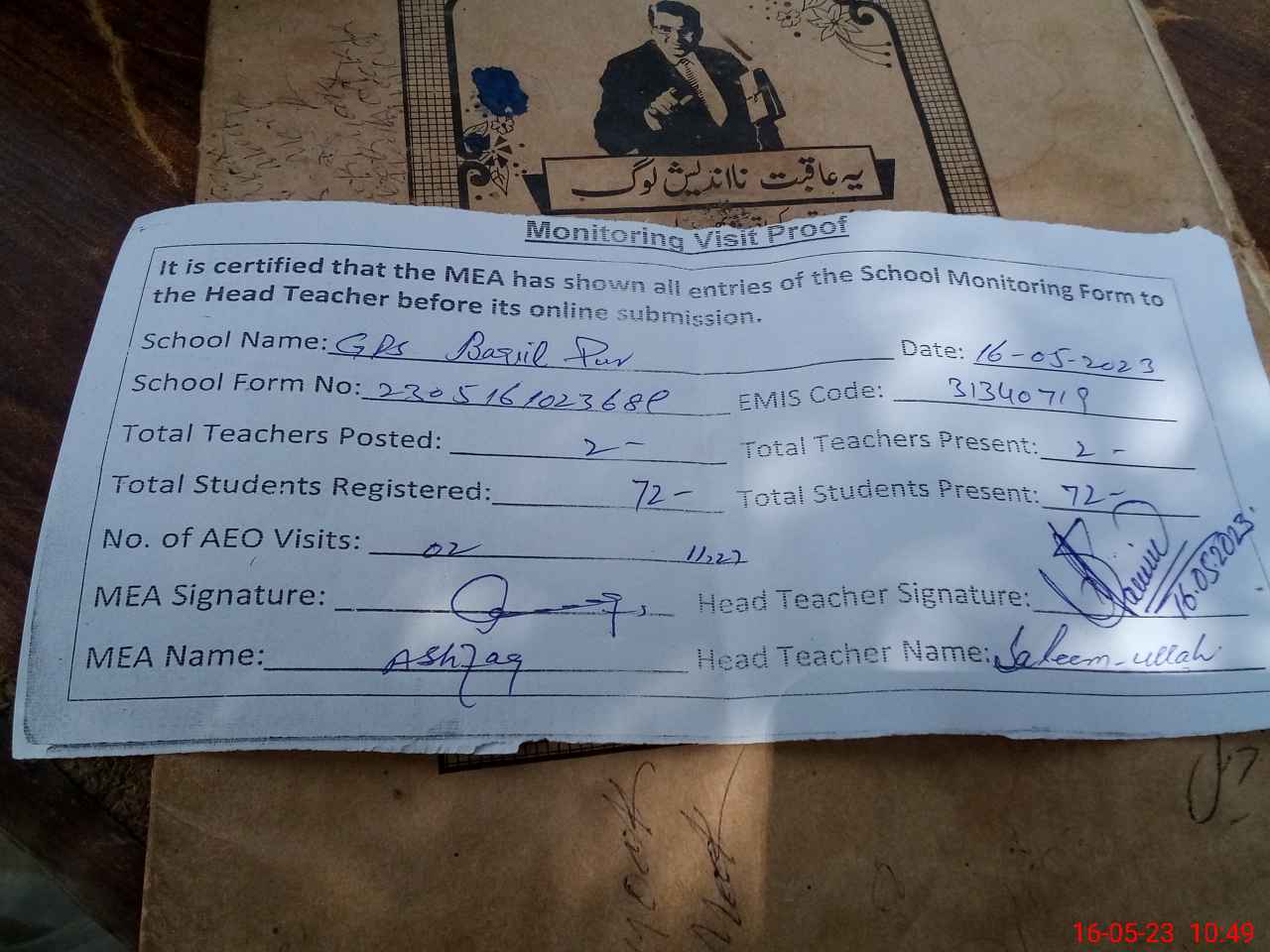 | Attendance Register | Head Teacher | MEA with School | Visit Proof |