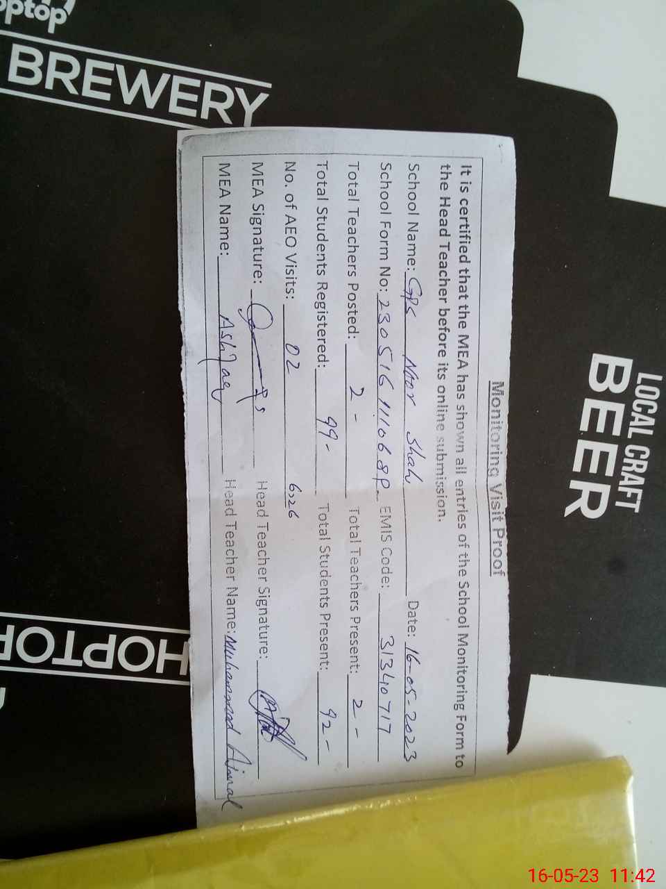 | Attendance Register | Head Teacher | MEA with School | Visit Proof |