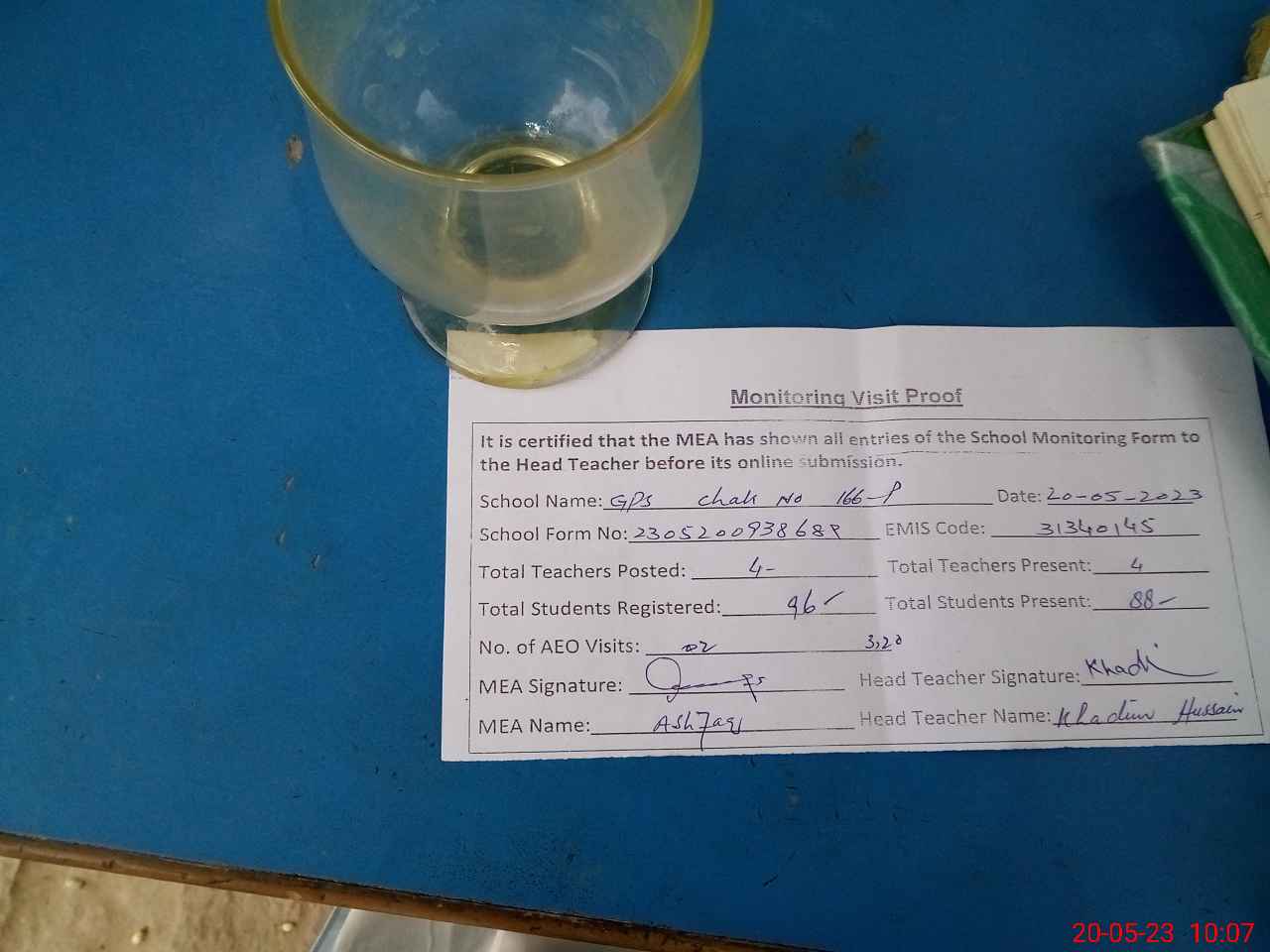 | Attendance Register | Head Teacher | MEA with School | Visit Proof |
