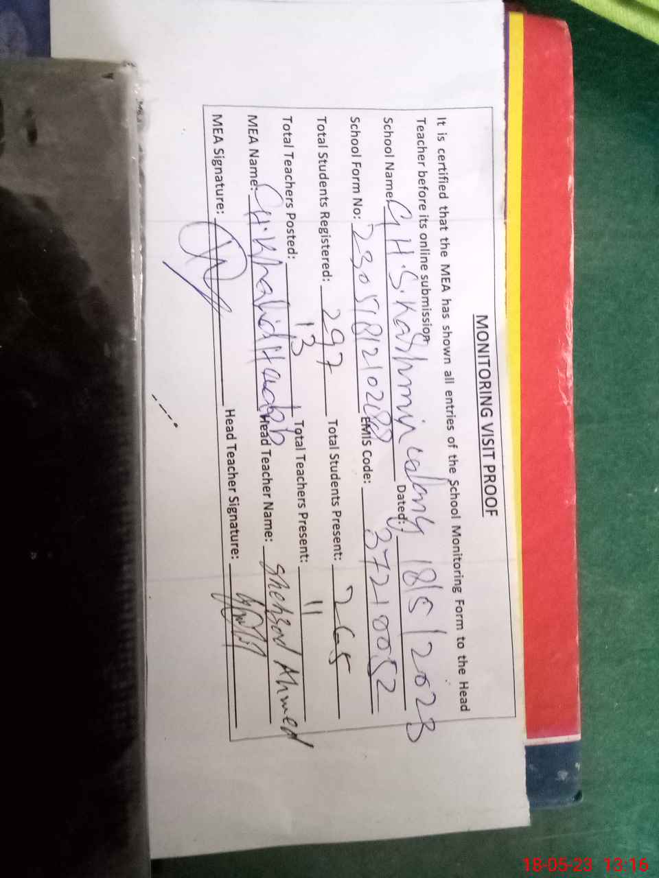 | Attendance Register | Head Teacher | MEA with School | Visit Proof |
