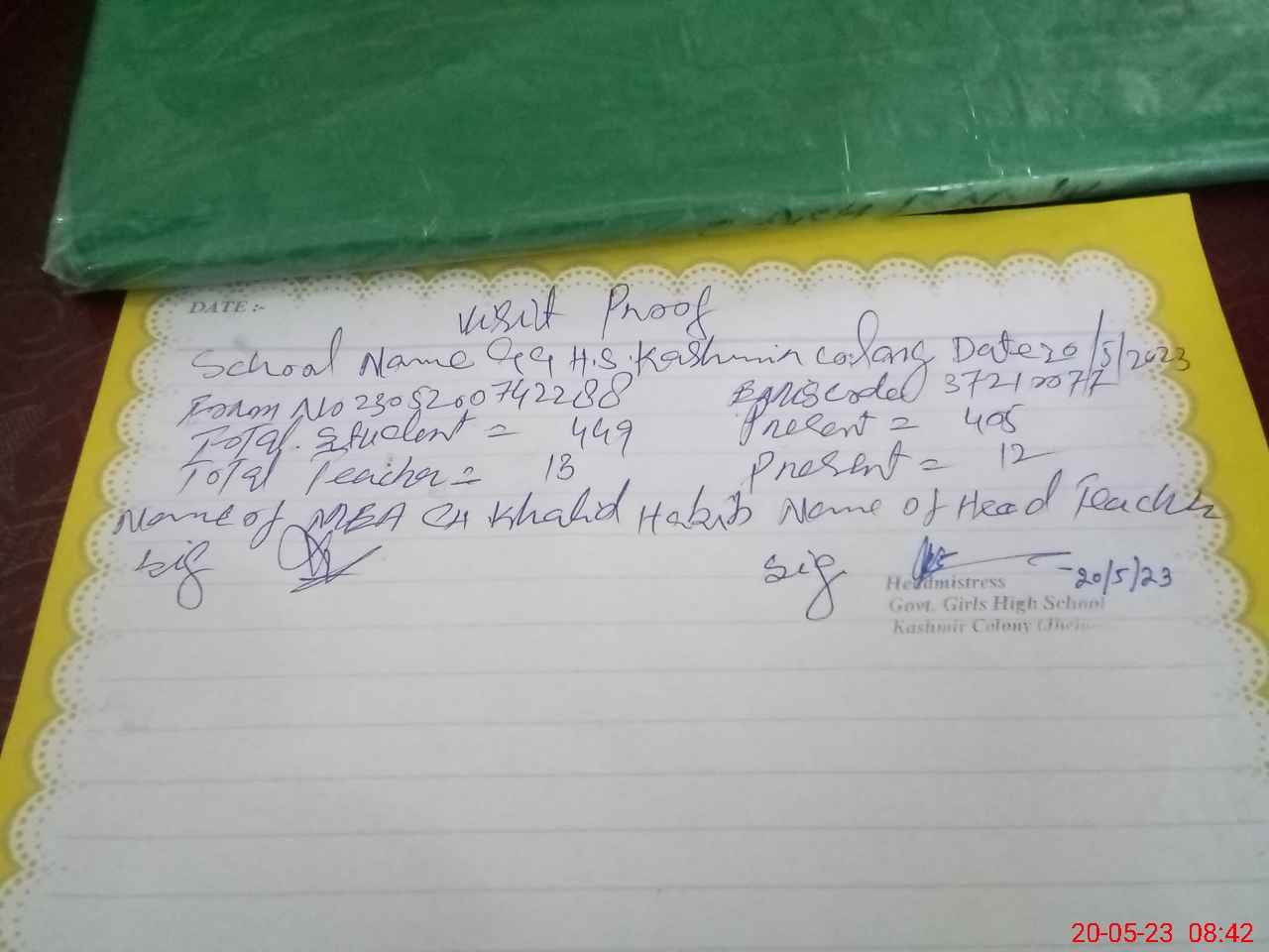 | Attendance Register | Head Teacher | MEA with School | Visit Proof |