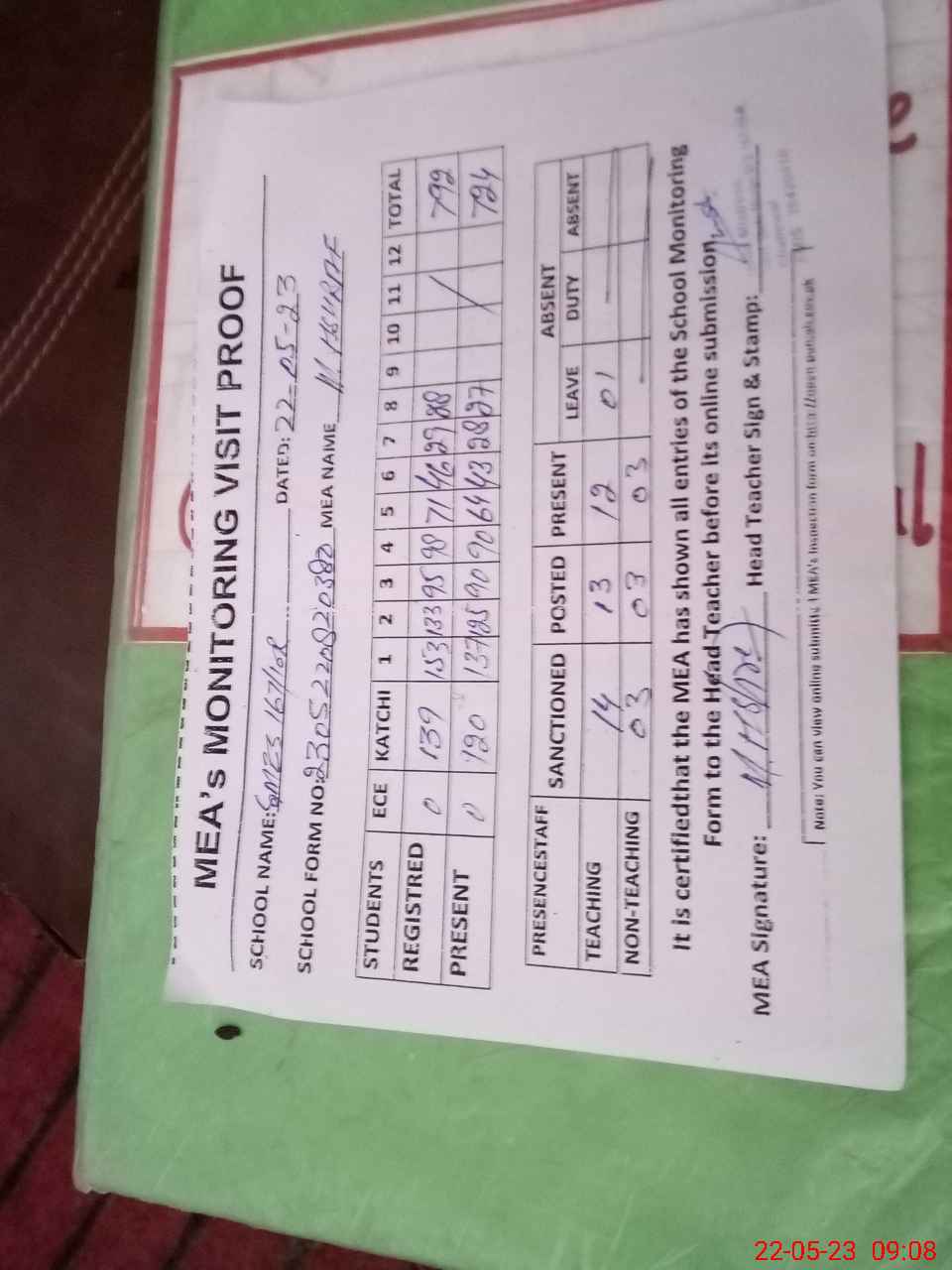 | Attendance Register | Head Teacher | MEA with School | Visit Proof |