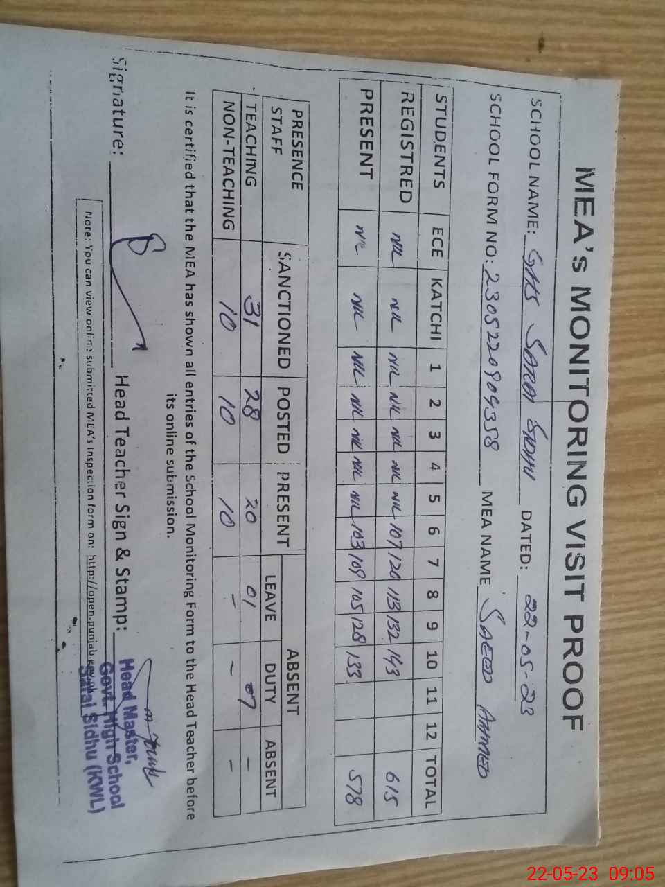 | Attendance Register | Head Teacher | MEA with School | Visit Proof |