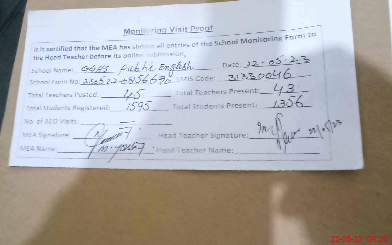 | Attendance Register | Head Teacher | MEA with School | Visit Proof |