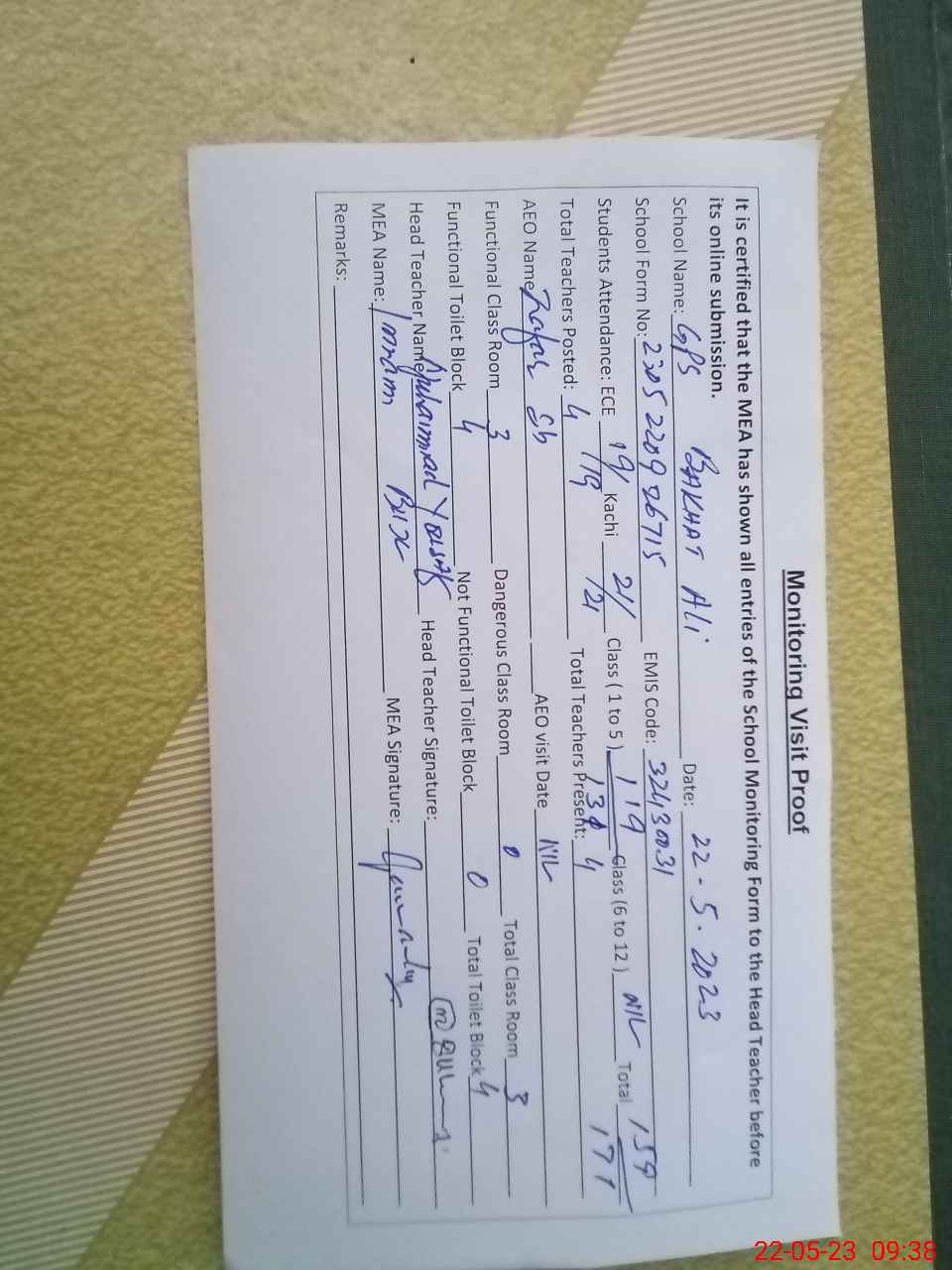 | Attendance Register | Head Teacher | MEA with School | Visit Proof |