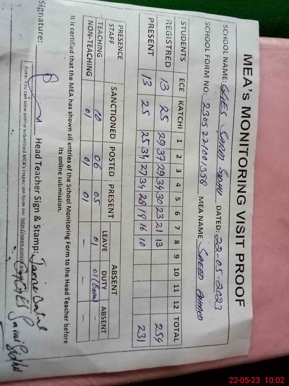 | Attendance Register | Head Teacher | MEA with School | Visit Proof |