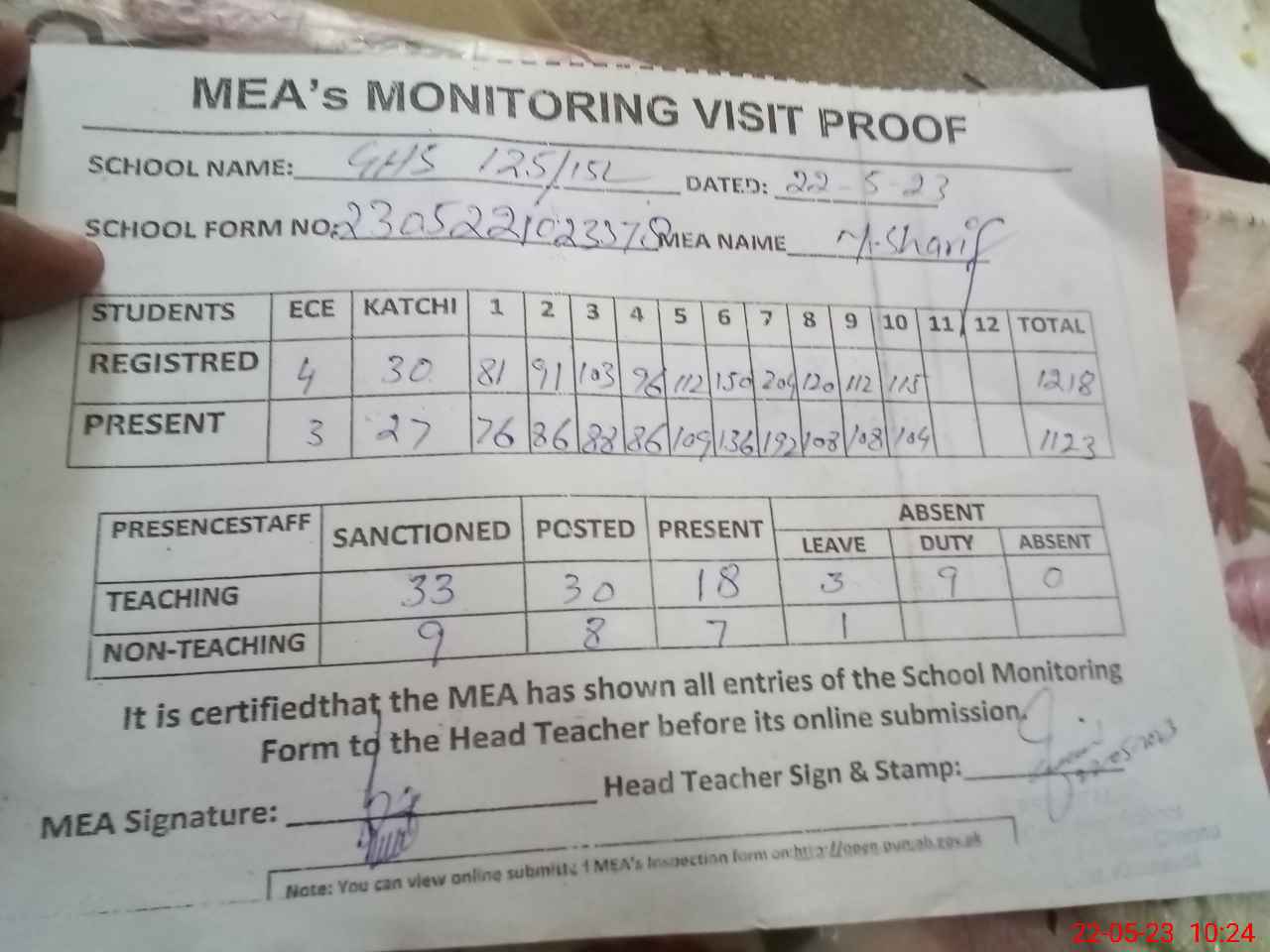 | Attendance Register | Head Teacher | MEA with School | Visit Proof |