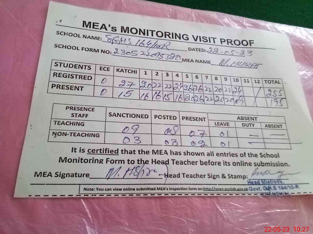 | Certified that this School was Inspected by the Undersigned MEA/DMO Today and the Information Stated Above is as Per Record. | |||||