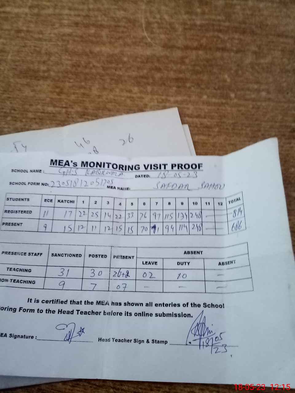 | Attendance Register | Head Teacher | MEA with School | Visit Proof |