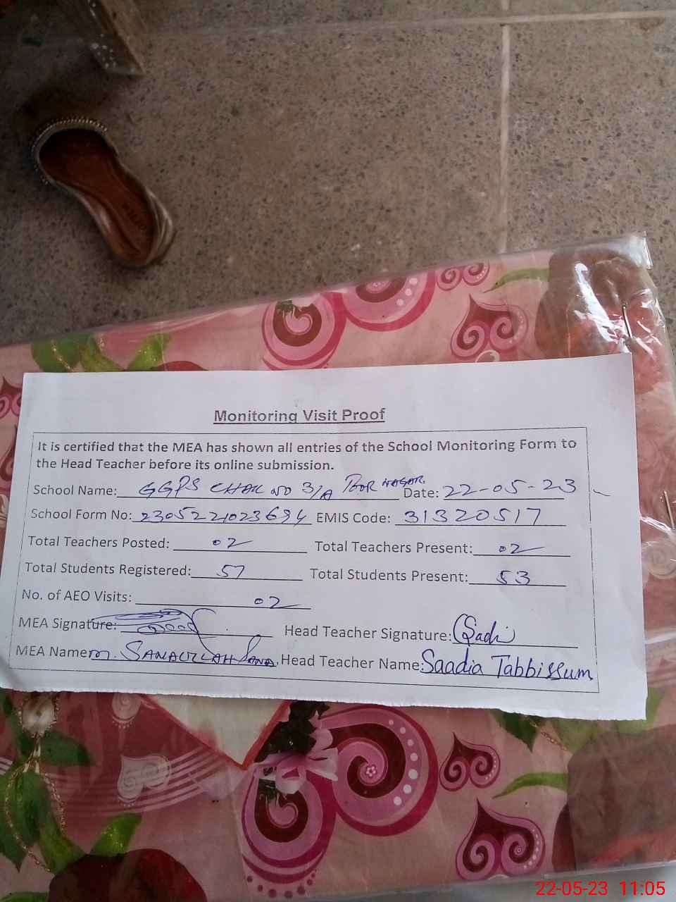 | Monitoring Date: 22-05-2023 | Start Time: 22-05-2023 10:23 AM | End Time: 22-05-2023 11:06 AM | Name of MEA: Mu**** Sa**** Ul**** Sa**** | |