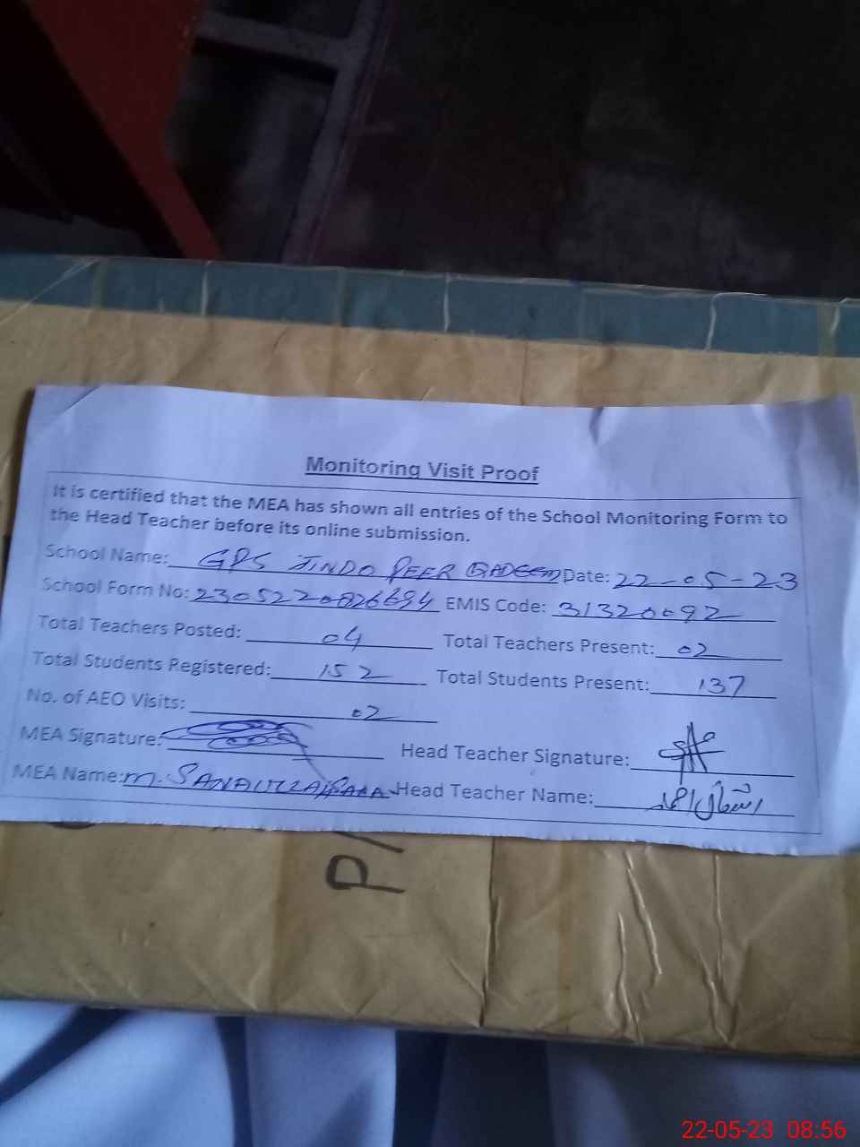 | Attendance Register | Head Teacher | MEA with School | Visit Proof |