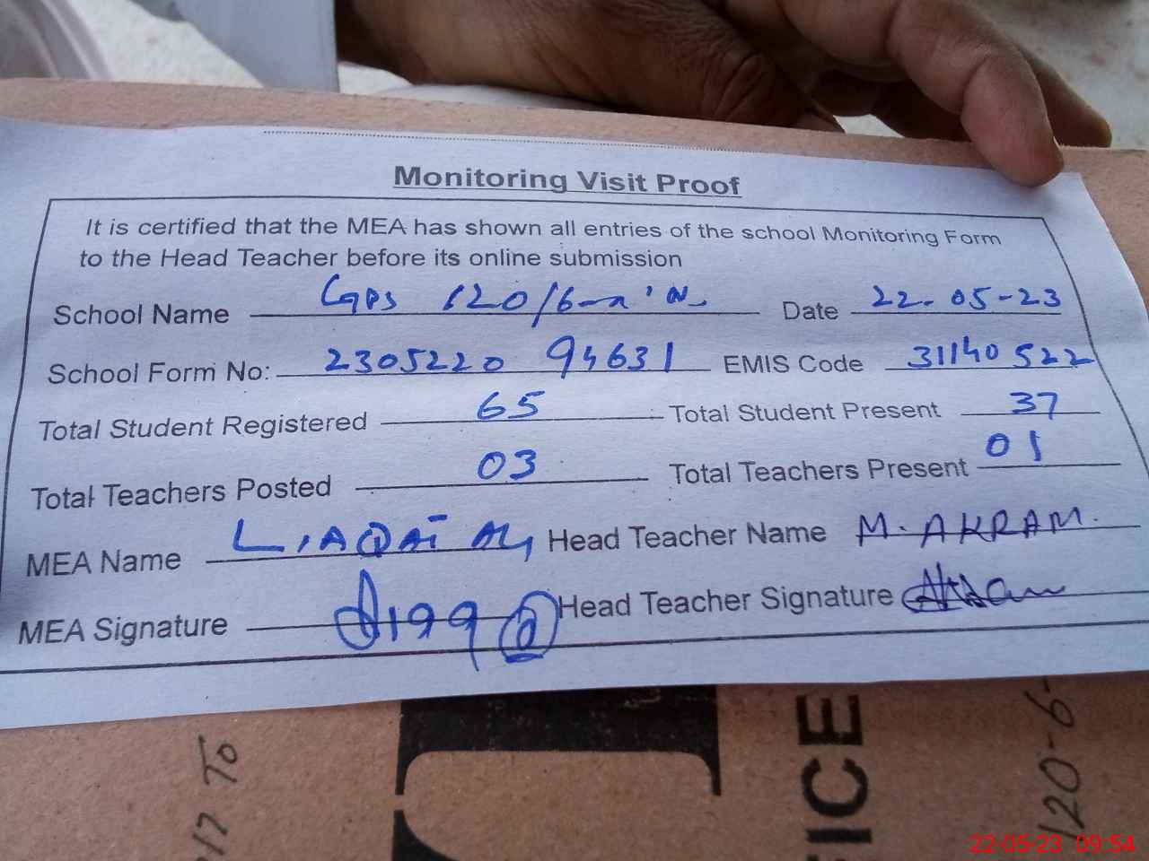 | EMIS Code: 31140522 | Name of School: GPS CHAK NO 120/6-R N | |||