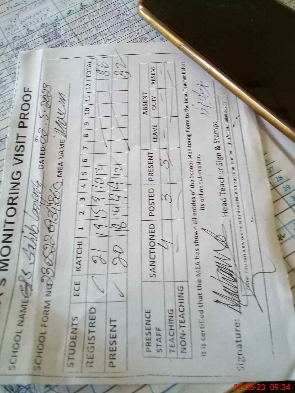 | Attendance Register | Head Teacher | MEA with School | Visit Proof |