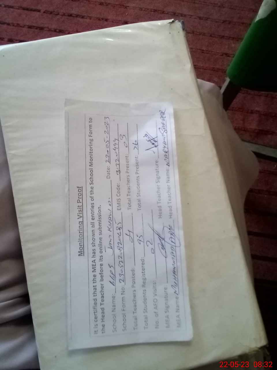 | Attendance Register | Head Teacher | MEA with School | Visit Proof |