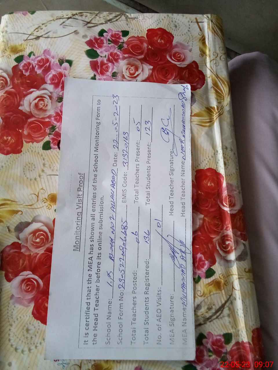 | Attendance Register | Head Teacher | MEA with School | Visit Proof |