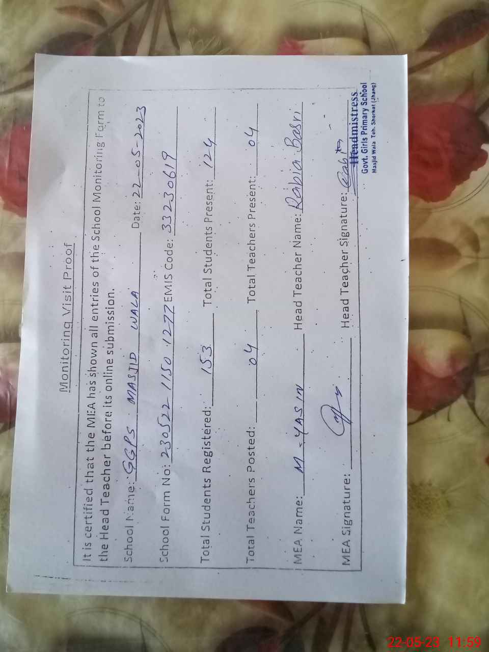 | EMIS Code: 33230619 | Name of School: GGPS MASJID WALA | |||