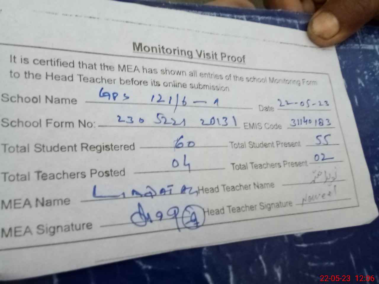 | Attendance Register | Head Teacher | MEA with School | Visit Proof |