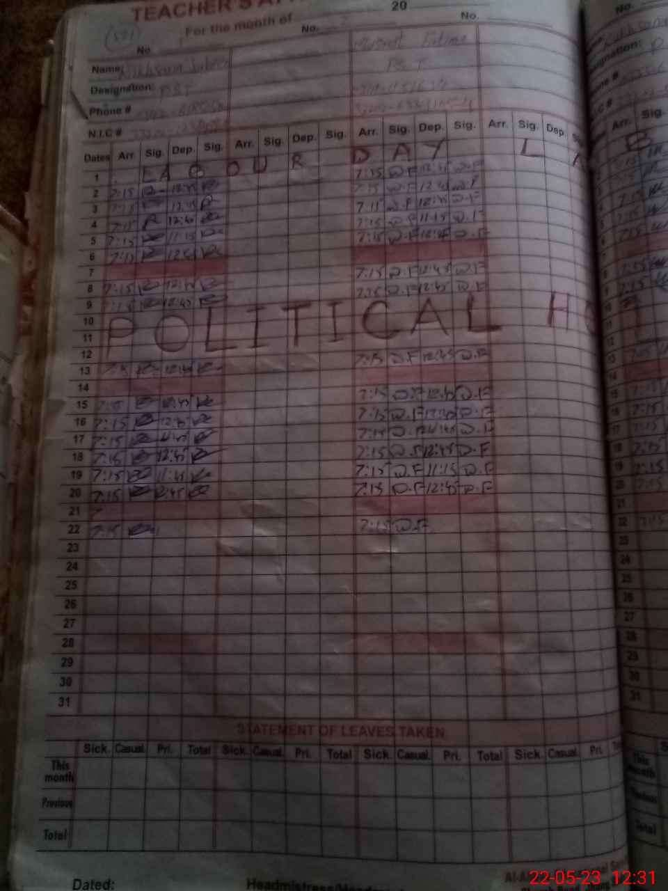 | CNIC | Full Name | Designation | R/C | Absence During Last Calender Month |