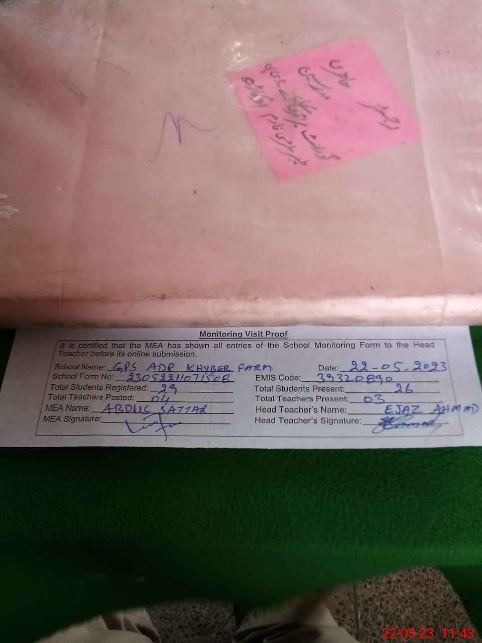 | Attendance Register | Head Teacher | MEA with School | Visit Proof |