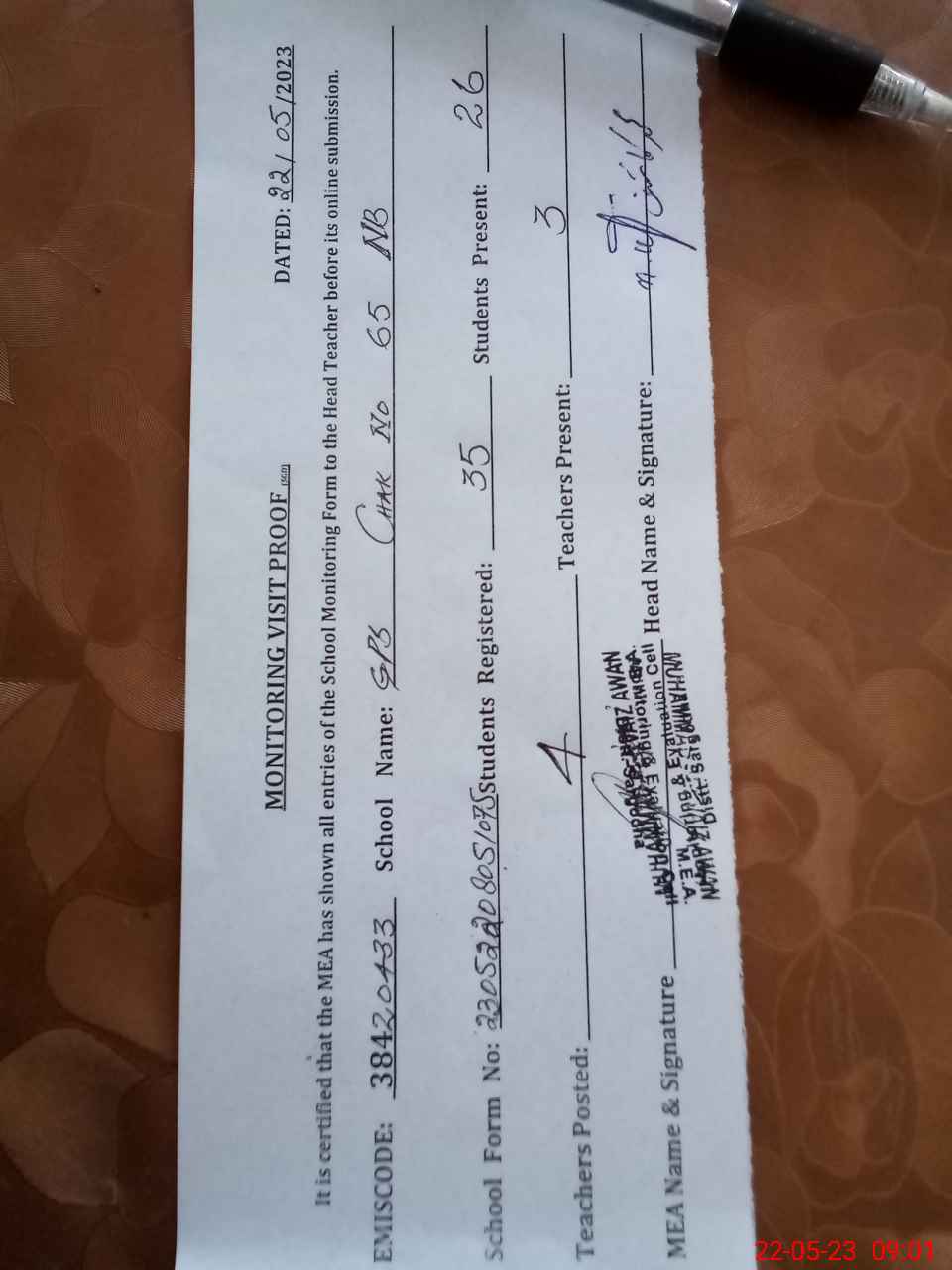| Attendance Register | Head Teacher | MEA with School | Visit Proof |