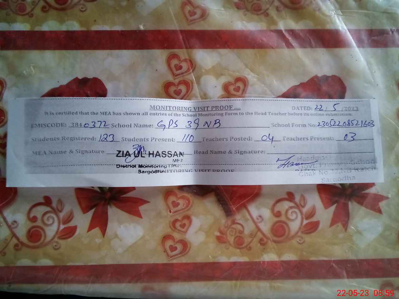 | Certified that this School was Inspected by the Undersigned MEA/DMO Today and the Information Stated Above is as Per Record. | |||||