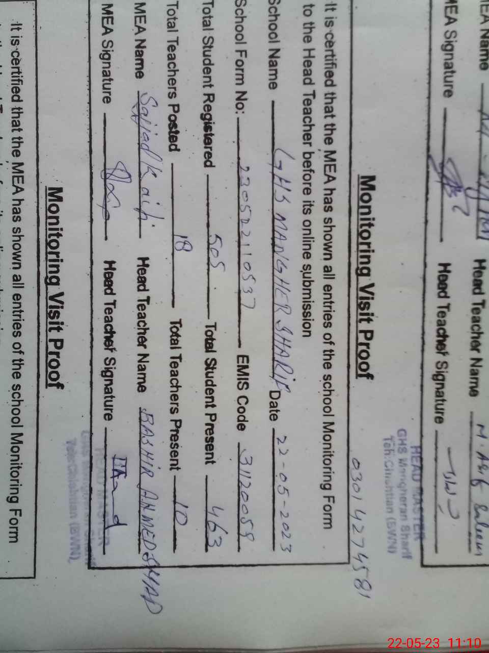 | Name: Ab**** Ha**** Designation: (School Headmaster's/Headmistress's) HEAD MASTER Phone/Cell Number: 03**** |