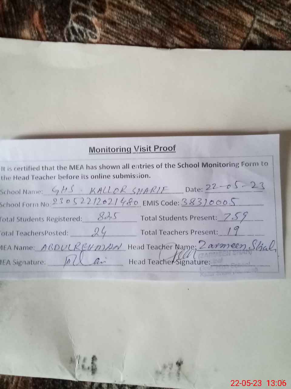 | Attendance Register | Head Teacher | MEA with School | Visit Proof |