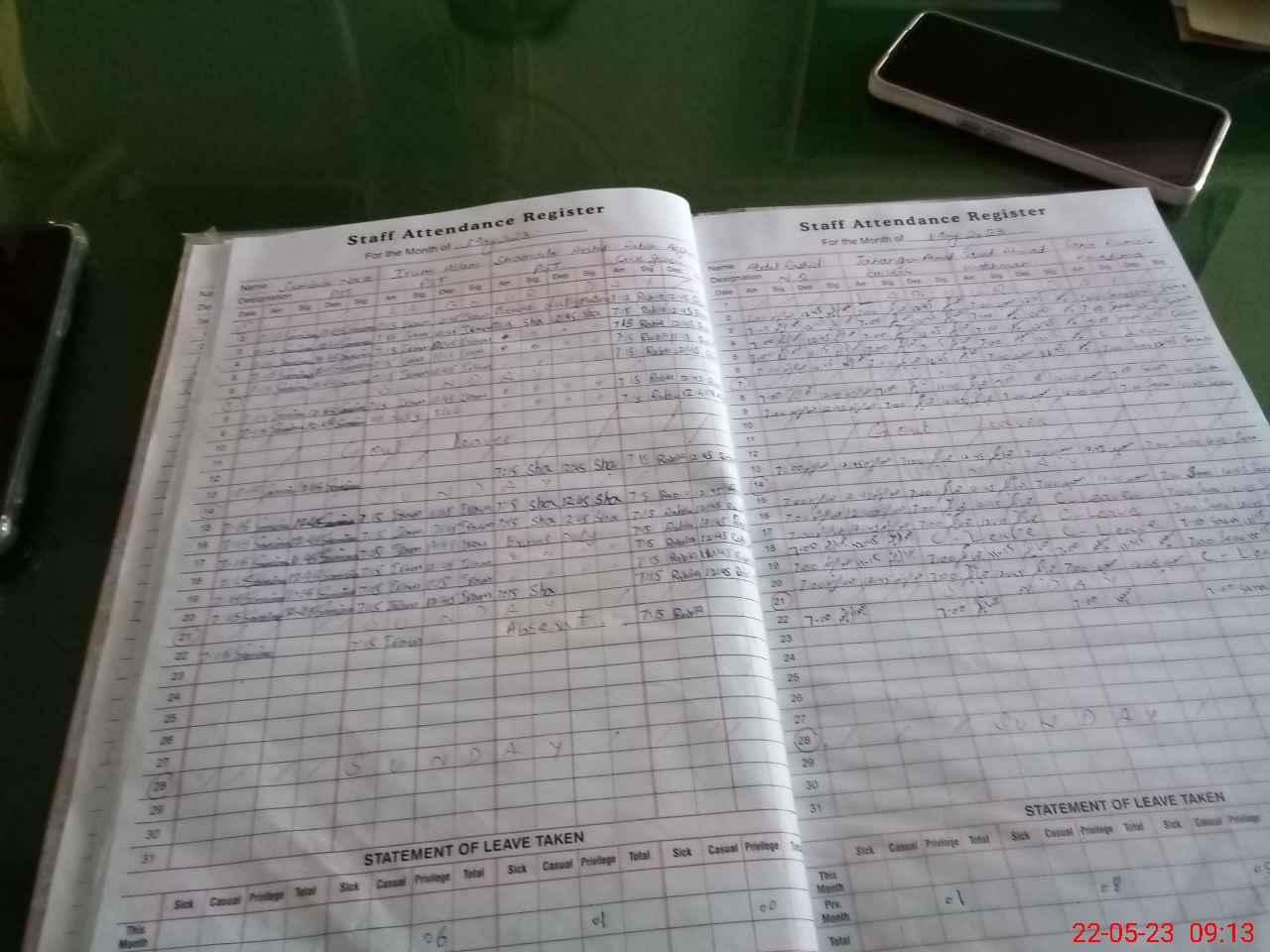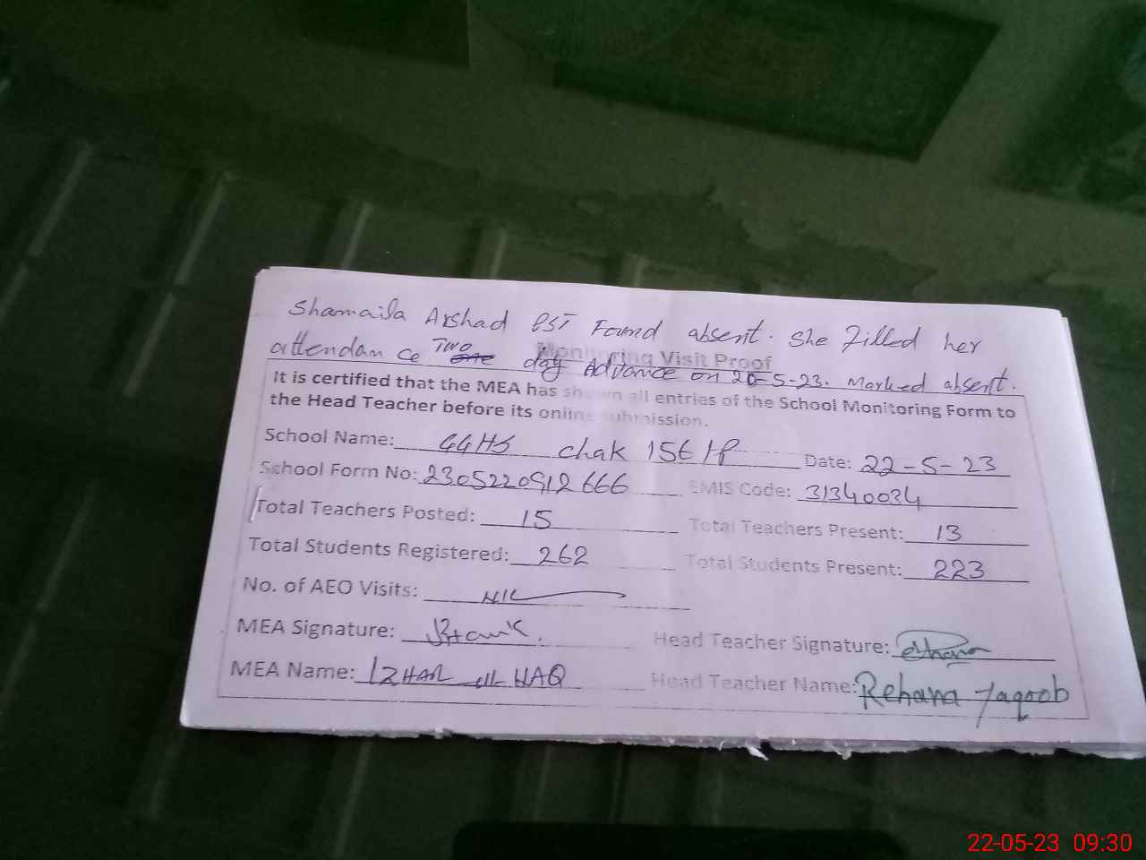 | Remarks (Use Separate Page if Required): Shamaila Arshad pst considered absent She filled her attendance two days advance on 20th may 2023 And absent today on 22nd may 2023 | |||||