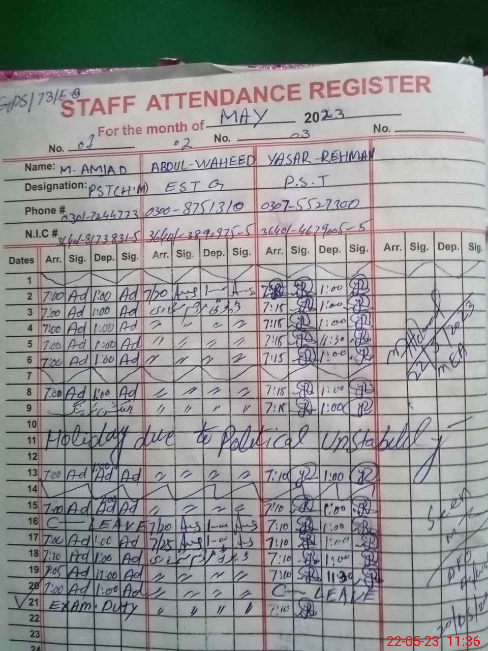 | CNIC | Full Name | Designation | R/C | Absence during last cal. month |
