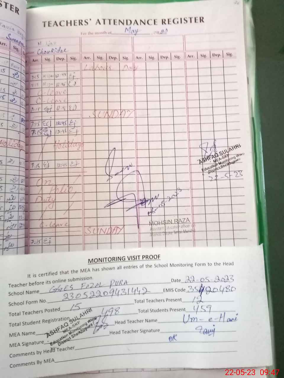 | Attendance Register | Head Teacher | MEA with School | Visit Proof |