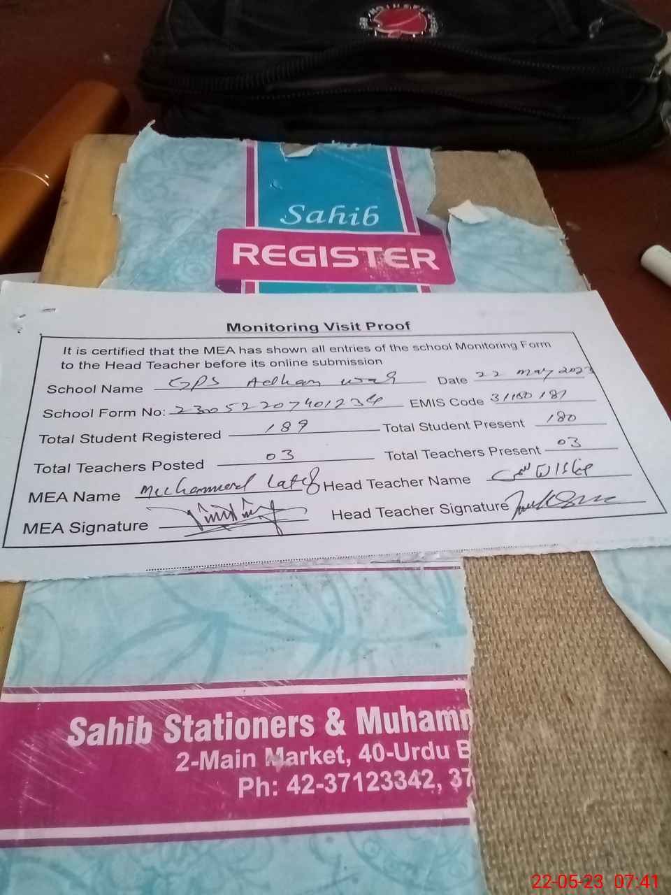 | Attendance Register | Head Teacher | MEA with School | Visit Proof |