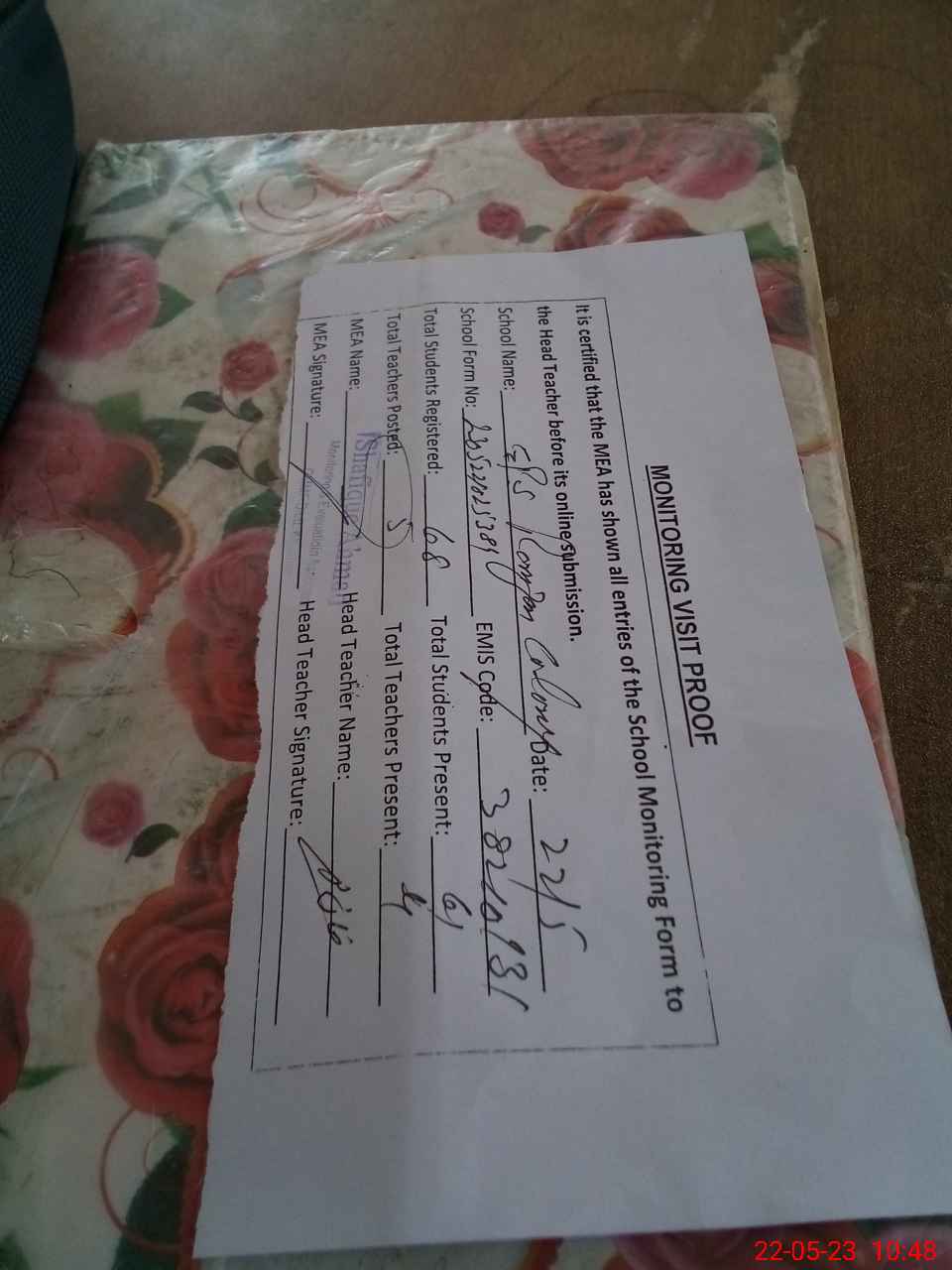 | Attendance Register | Head Teacher | MEA with School | Visit Proof |