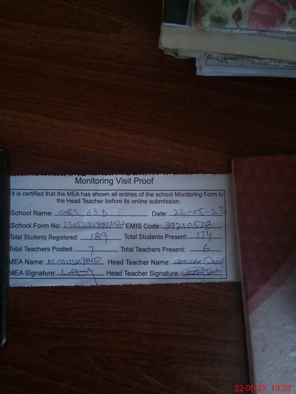 | Attendance Register | Head Teacher | MEA with School | Visit Proof |