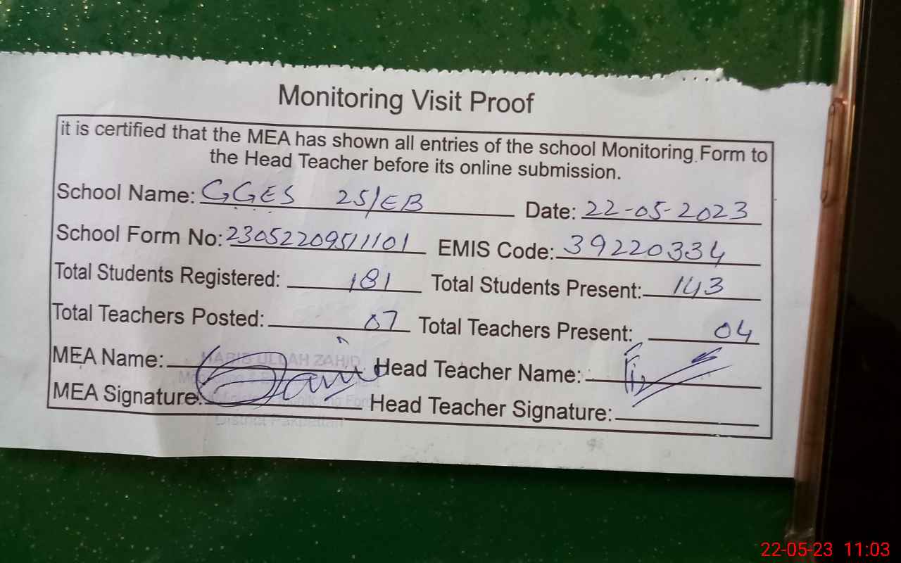 | EMIS Code: 39220334 | Name of School: GGES CHAK NO 25 EB | |||