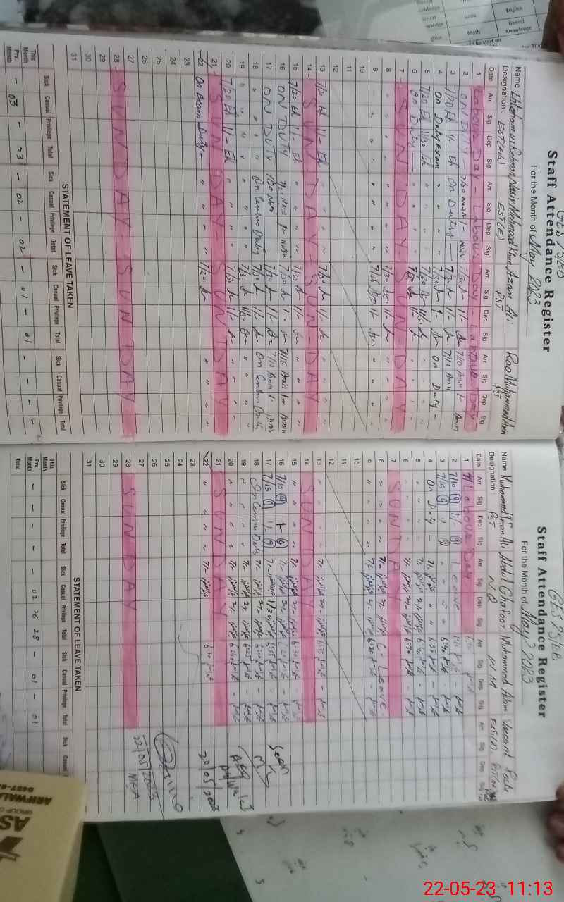 | CNIC | Full Name | Designation | R/C | Absence During Last Calender Month |