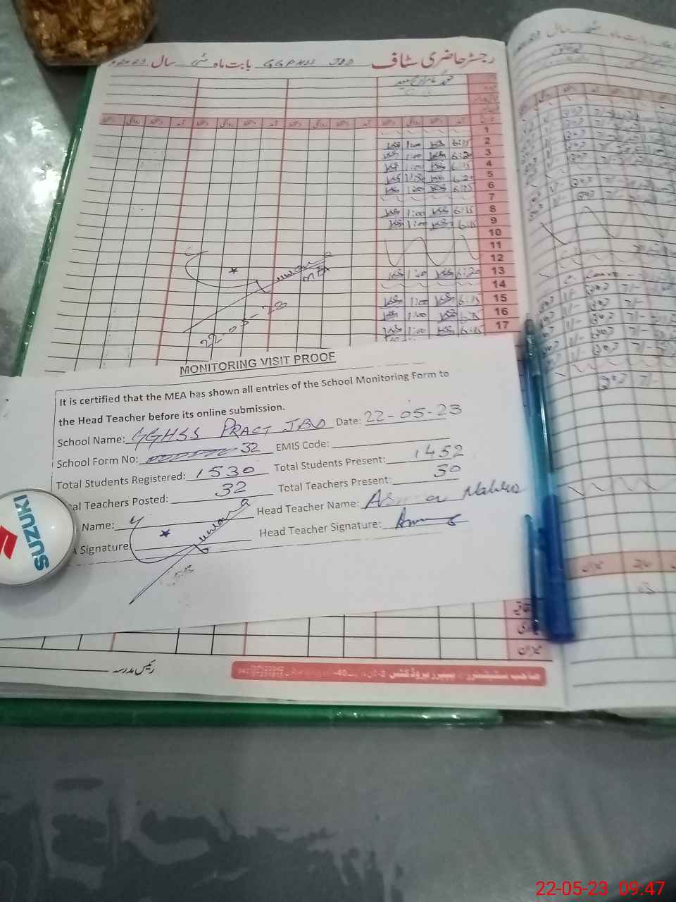 | Attendance Register | Head Teacher | MEA with School | Visit Proof |