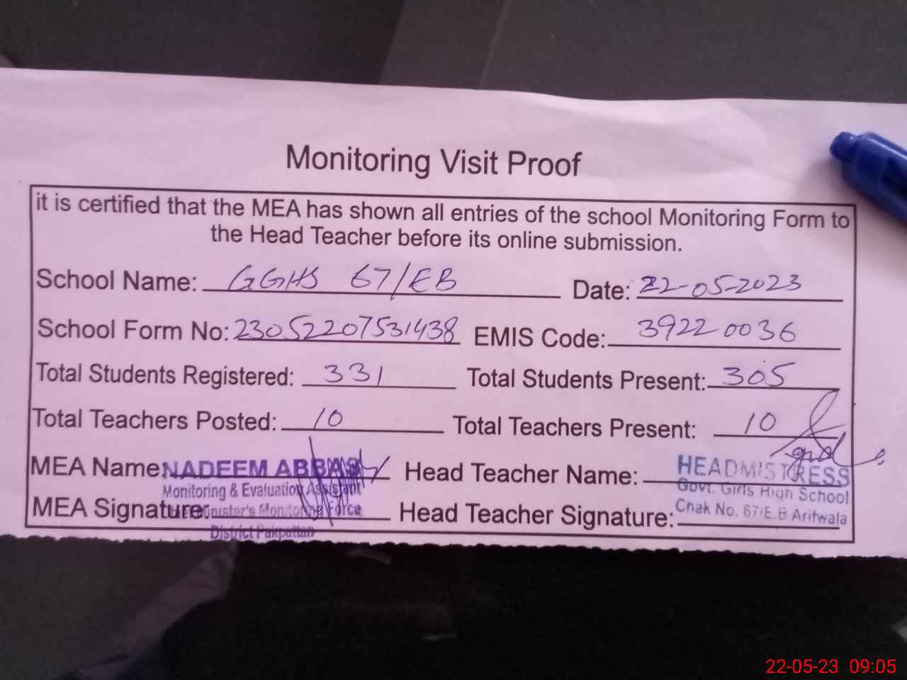 | Attendance Register | Head Teacher | MEA with School | Visit Proof |