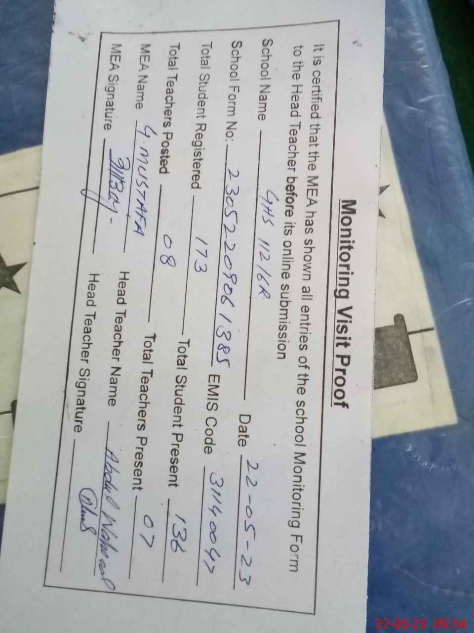 | EMIS Code: 31140047 | Name of School: GHS CHAK NO. 112/6-R | |||