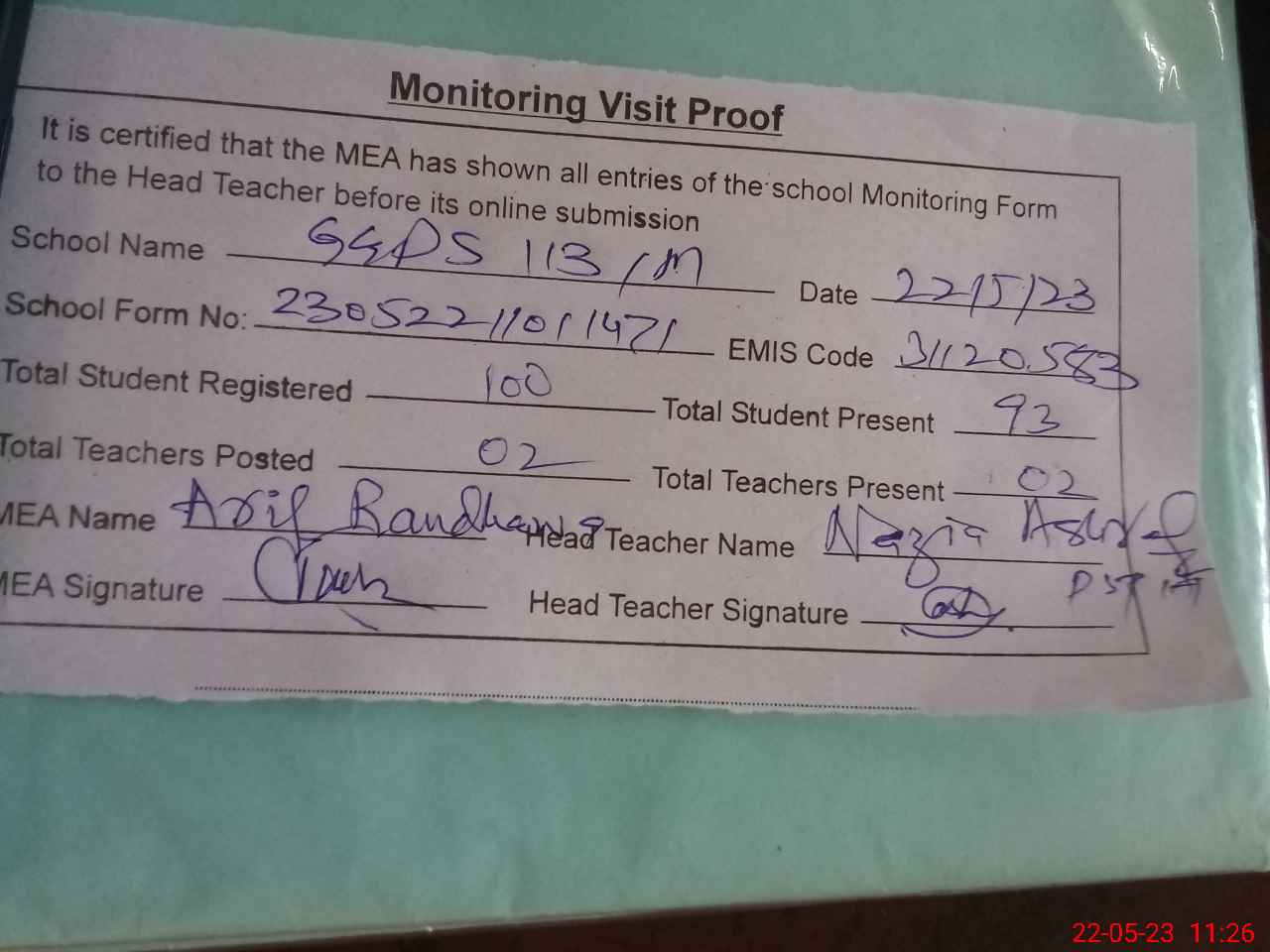 | Attendance Register | Head Teacher | MEA with School | Visit Proof |