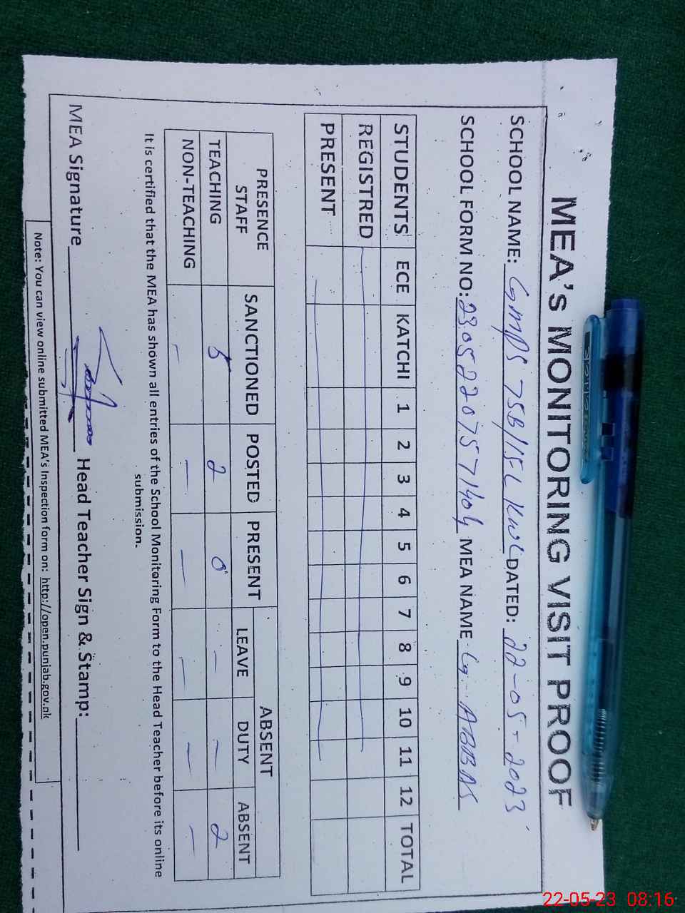| Attendance Register | Head Teacher | MEA with School | Visit Proof |