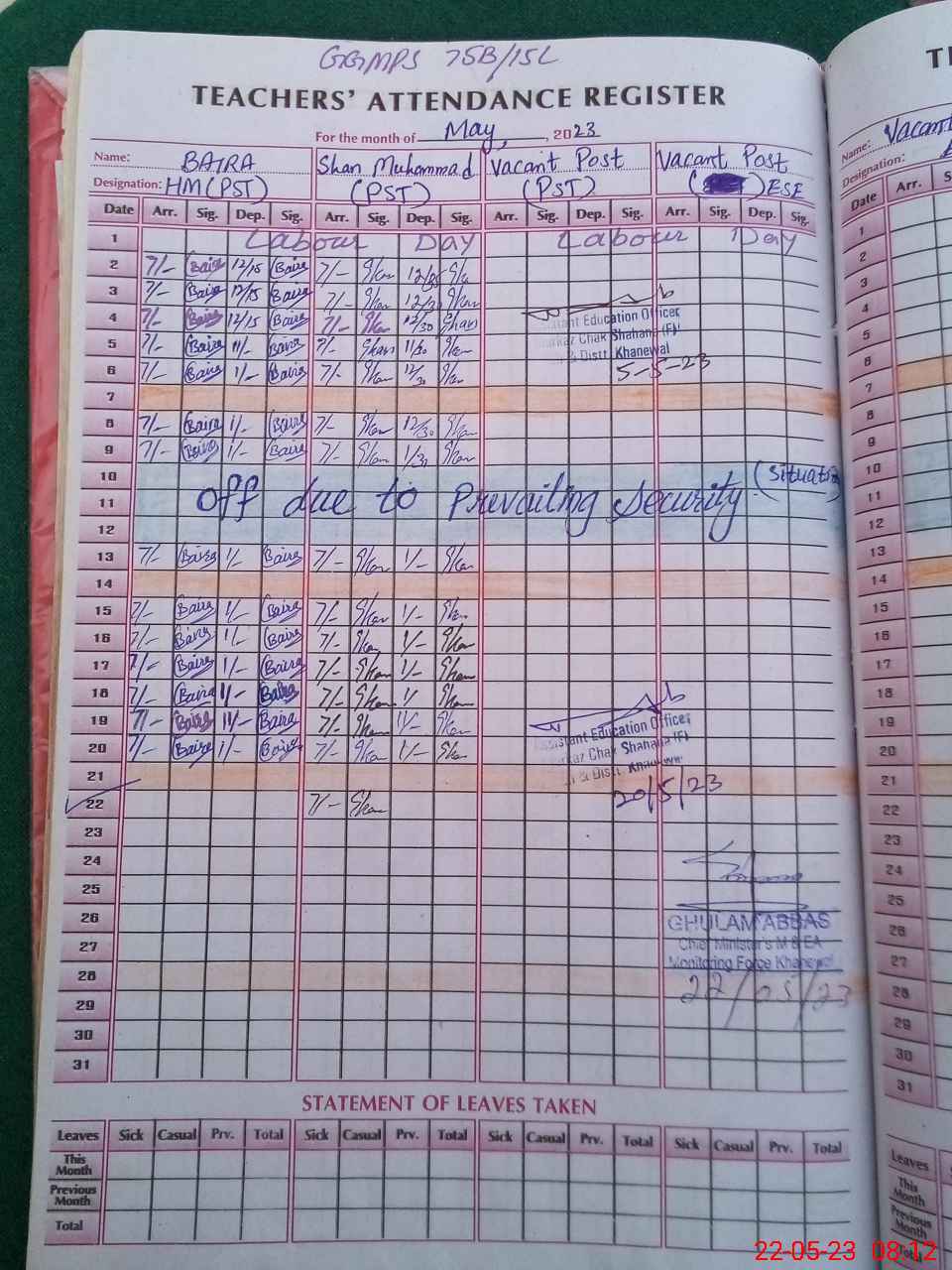 | Remarks (Use Separate Page if Required): Visited at 0755 hrs to 0820 hrs no any teacher available in school only one private teacher is present but all school record is locked roznamcha students attendance registers and all type record is locked in room | |||||
