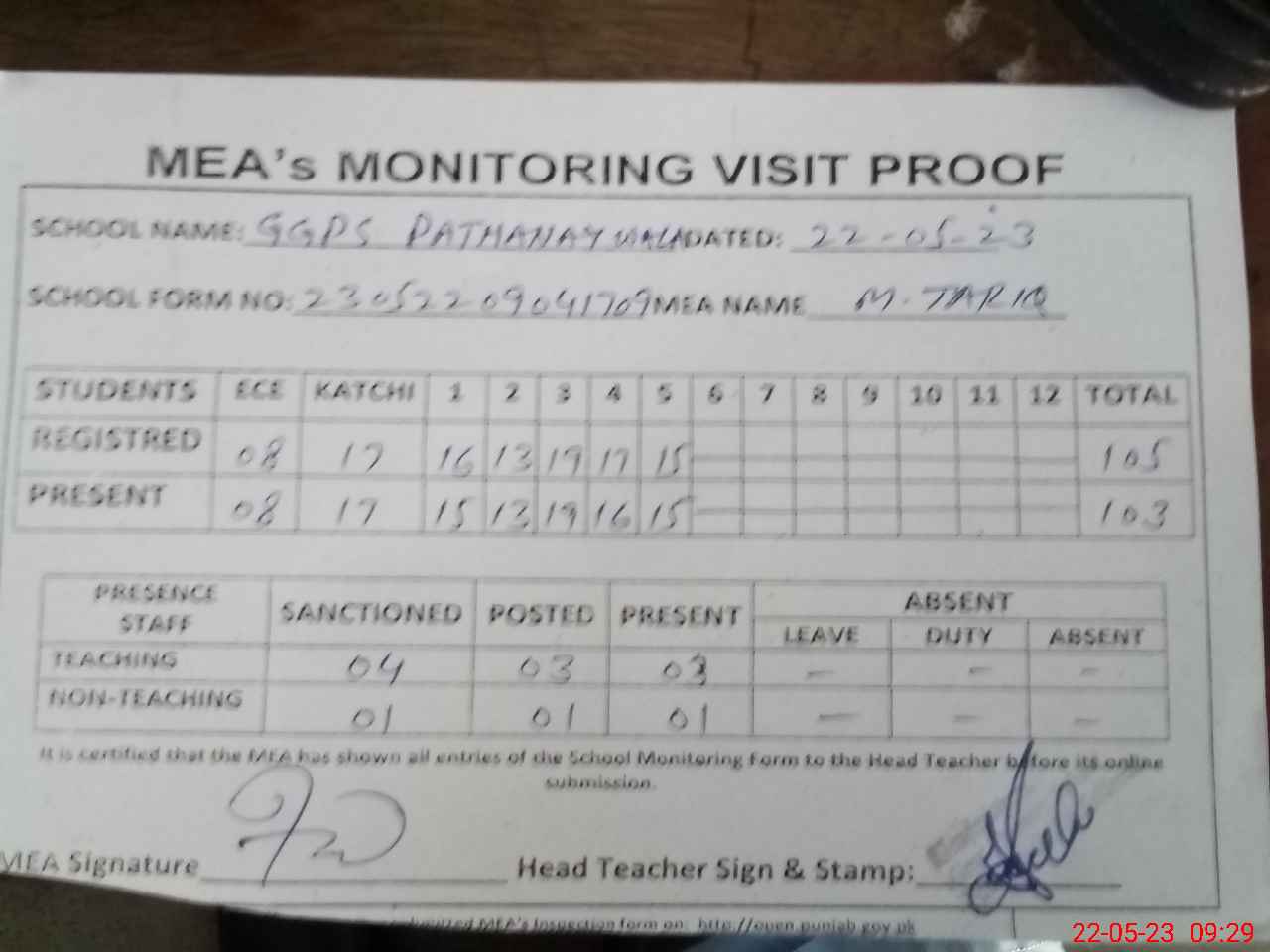 | Attendance Register | Head Teacher | MEA with School | Visit Proof |