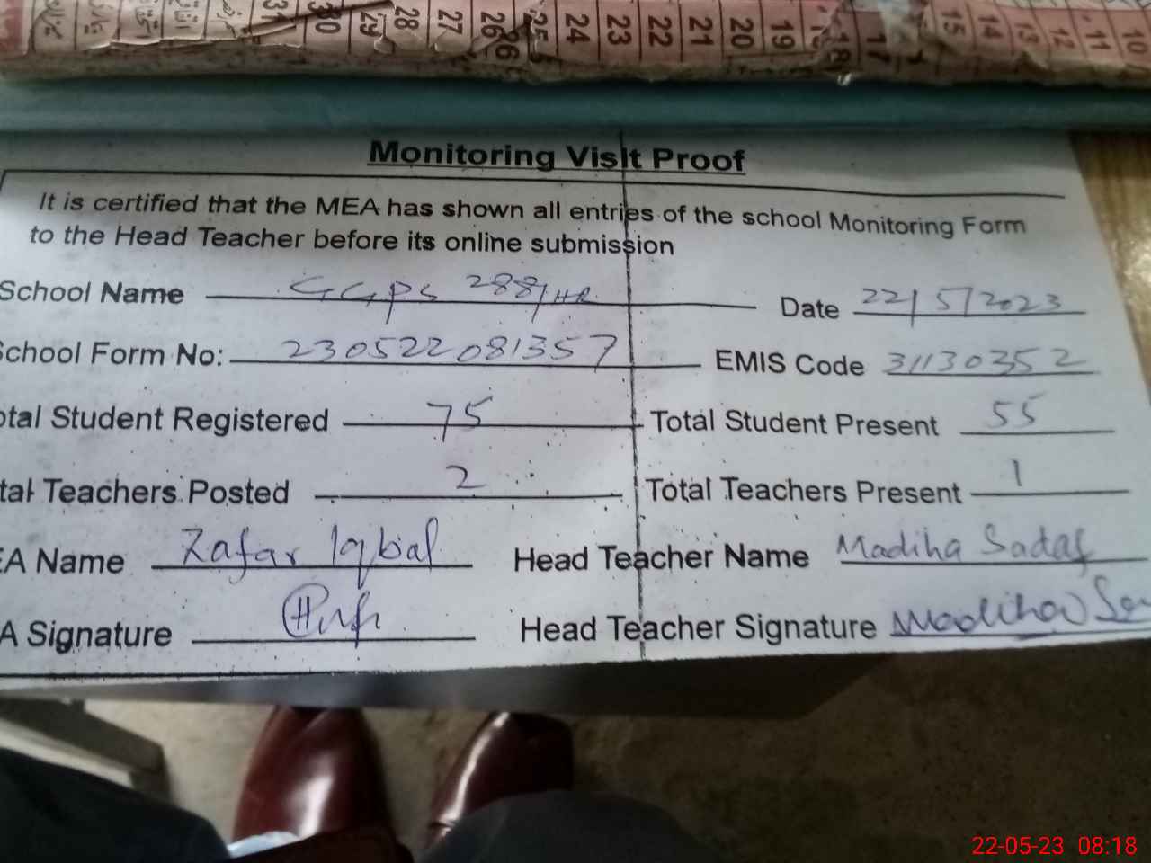 | Monitoring Date: 22-05-2023 | Start Time: 22-05-2023 08:01 AM | End Time: 22-05-2023 08:18 AM | Name of MEA: Za**** Iq**** BN**** | |