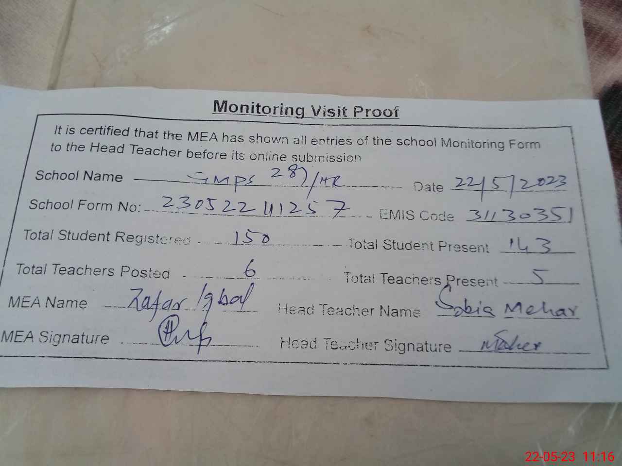 | Attendance Register | Head Teacher | MEA with School | Visit Proof |
