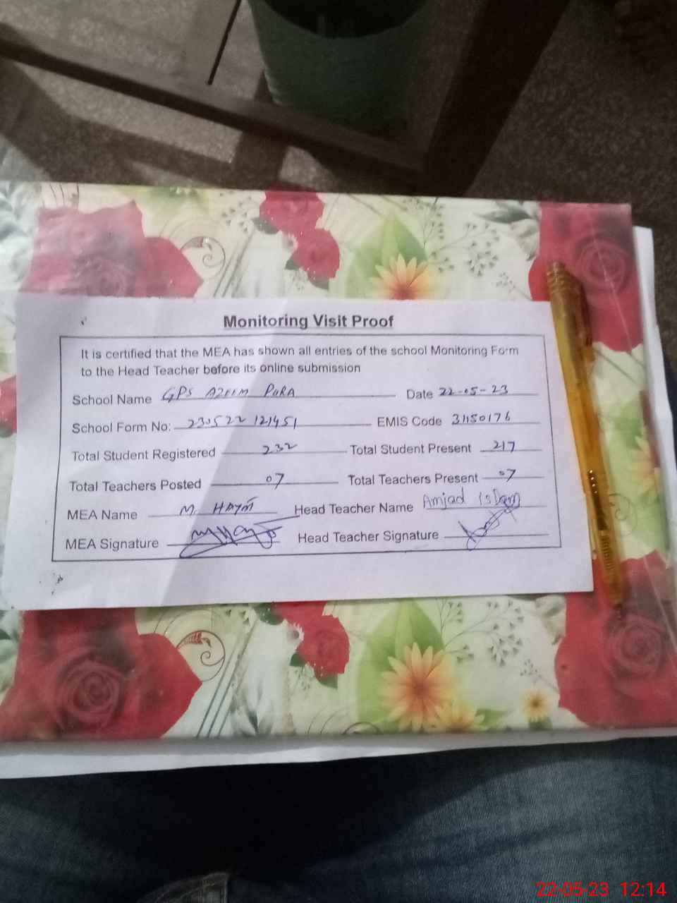 | Attendance Register | Head Teacher | MEA with School | Visit Proof |